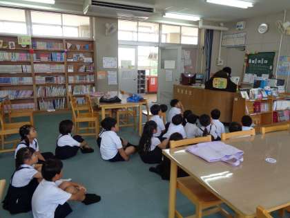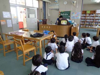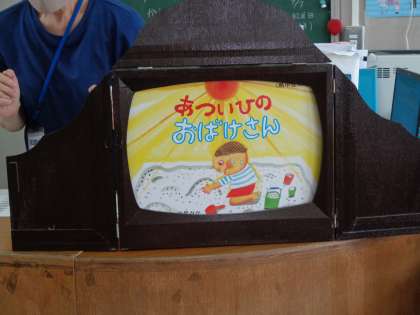 図書の授業です。「あついひのおばけ」の紙芝居を読んでもらいました。