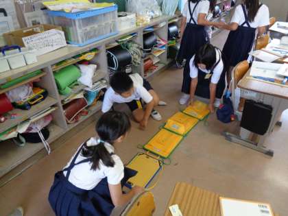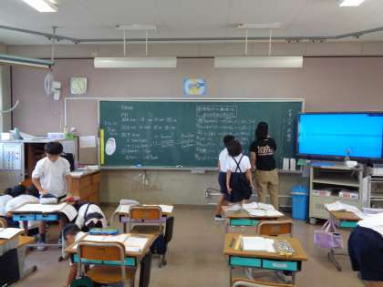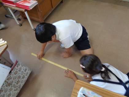 算数の授業です。教室のたてと横の長さをはかる方法を考えました。