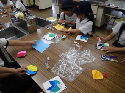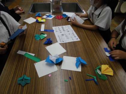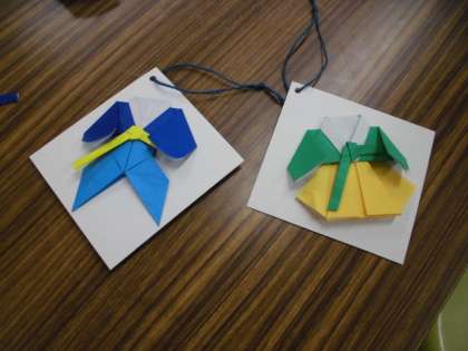 折り紙でチョゴリを作り、台紙に張り合わせて飾りにしました。少し難しかったけど、みんな上手にできました。