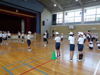 体育の授業です。リズムに合わせて跳ぶバランスをとるなど体つくりの運動に取り組みました。
