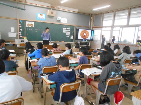 5年生は社会。「5円玉のデザイン」から日本人と稲作との関りについて学習していました。