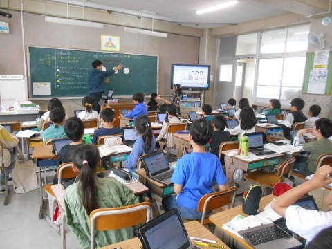 デジタルで考えを共有したり、実際に黒板で考え方を発表したり、ハイブリッドな授業ですね。
