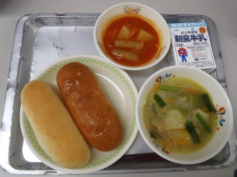 今日の給食は「ミニパン・揚げパン、牛乳、ワンタン、ウインナーのトマト煮」でした。