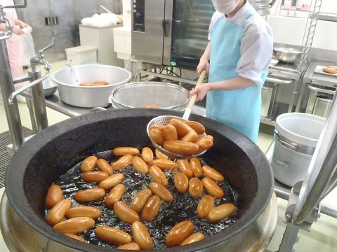 揚げパンは学校の釜で揚げて、グラニュー糖をまぶしています。今日もカリカリに揚げてくれていました。