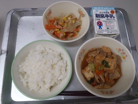 今日の給食は,「ごはん,牛乳,チャージャン豆腐,ごぼうサラダ,マヨごまドレッシング」です。