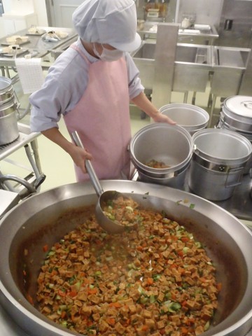 給食では,厚揚げを使って作っています。
