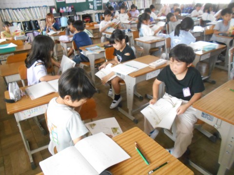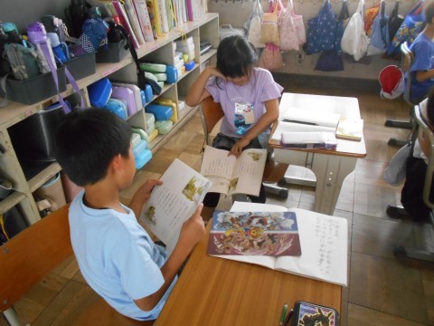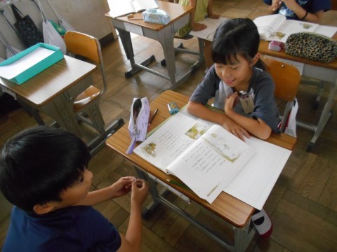 ペアで,ガマくんとカエルくん,それぞれの役割で音読しています。