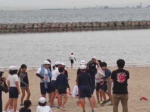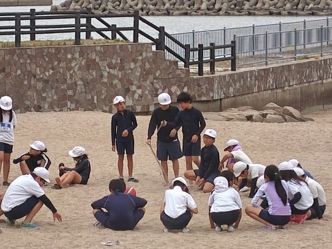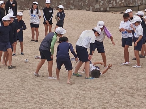 友だちの 右、左という声を聞いてすいか(ボール)をめざします。