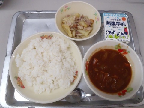 今日の給食は「ごはん,牛乳,ハヤシカレーライス,えのきベーコン」です。