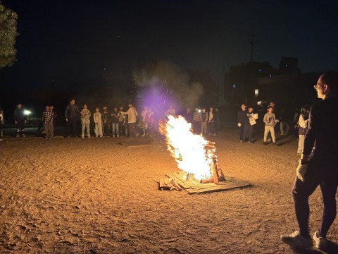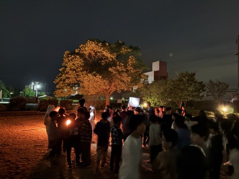 火の神から火をもらい、キャンプファイヤーが始まりました。実行委員がマルバツクイズをしています。