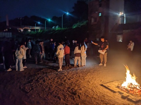 火を囲んだレクレーション。実行委員の話を聞きつつも、ついつい火に見入ってしまいます。