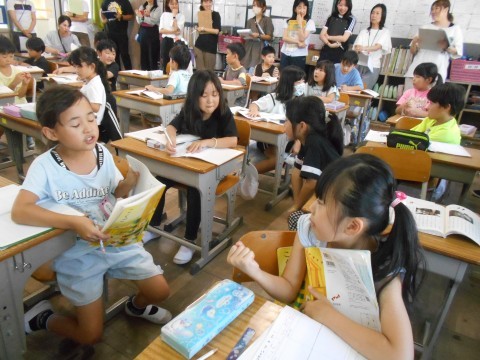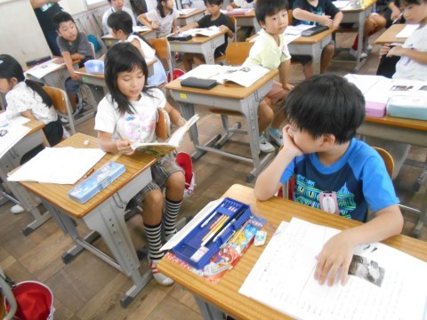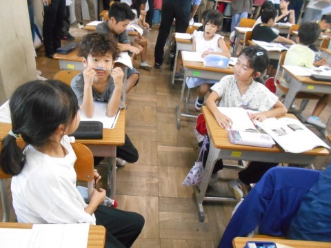 隣近所と話し合う姿が見られます。「個人」→「ペア」と学習が進みます。