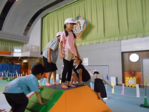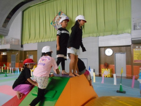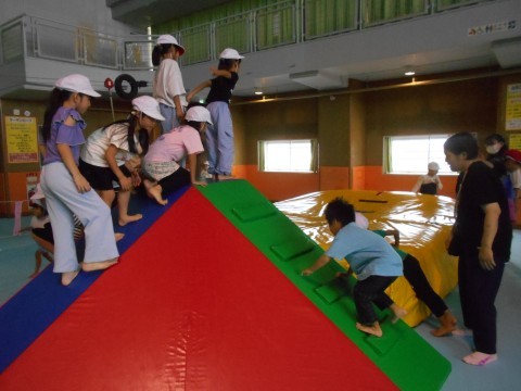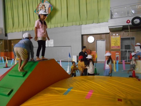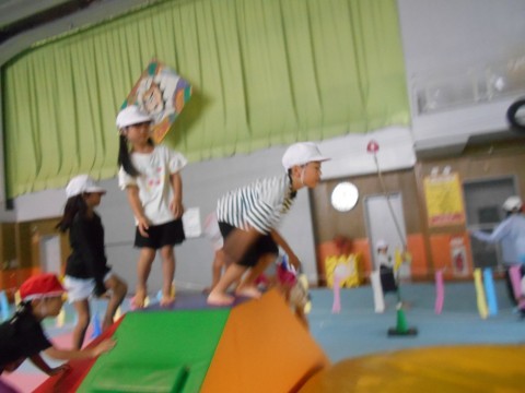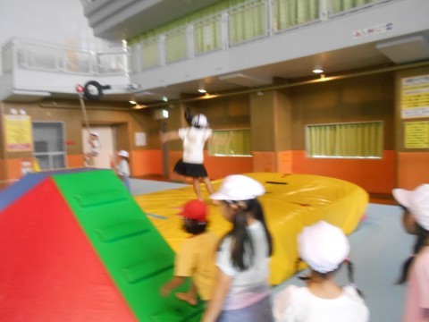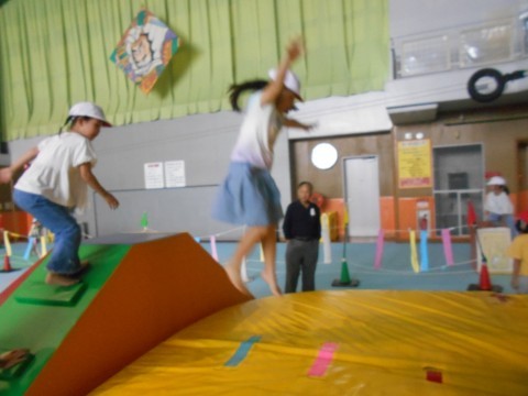 セーフティマットの上に飛び込む遊び。どこまで跳べるか,思いっきりジャンプしていました。