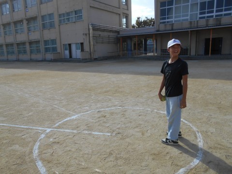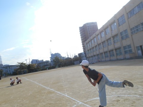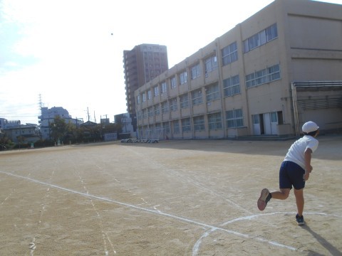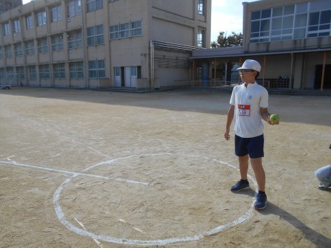 代表児童がデモンストレーションしてくれました。これはソフトボール投げです。