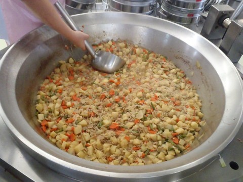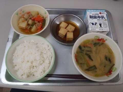 今日の給食は「ごはん,牛乳,五目汁,厚揚げのしょうが焼き,肉じゃが」です。
