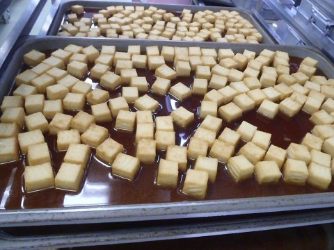 今日は,厚揚げに砂糖・みりん・しょうゆ・土しょうがを混ぜ合わせたたれをかけオーブンで焼きました。