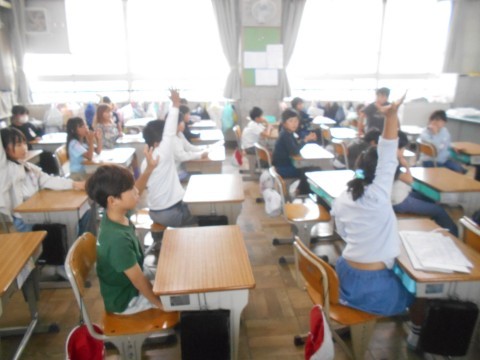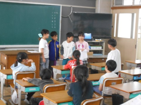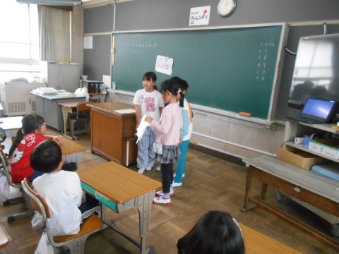 2年生の様子です。「えがおのひみつ」というテーマ。浅香山校区商店街の人たちから聞いたお話をまとめ,クラスで伝え合っていました。