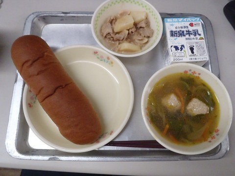 今日の献立は「ココアパン・牛乳・肉団子スープ・豚肉のみそマヨガーリック炒め」でした。