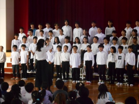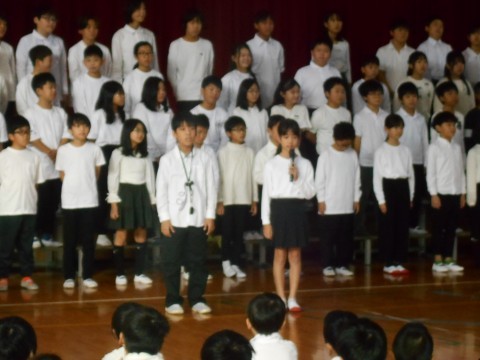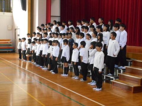 全校児童にお披露目する「連音激励会」の日。練習より緊張気味な様子が伝わります。