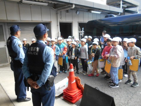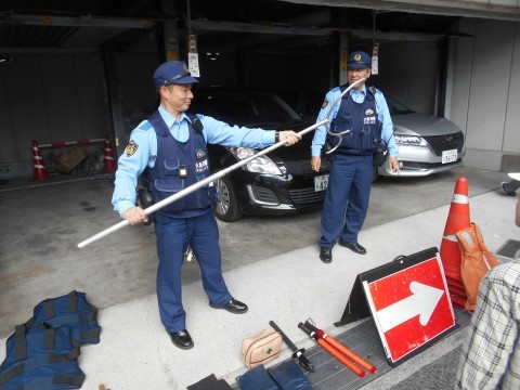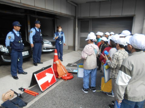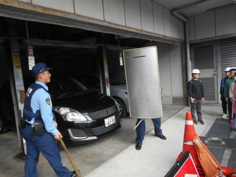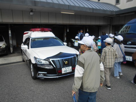 警察署の外に出て,パトカーが停まっている場所へ。パトカーに積んでいる物の数々を紹介してもらいました。