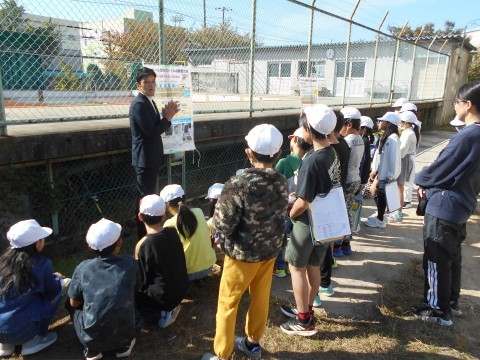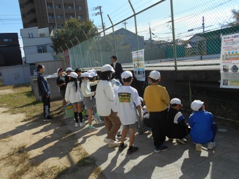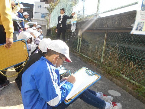 マンホールトイレについて学び中。プールのすぐ横にあるマンホールがトイレに変身する仕組みを聞き,メモしていました。