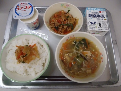 今日の給食は「ごはん,牛乳,春雨スープ,スタミナ丼の具,ヨーグルト」です。