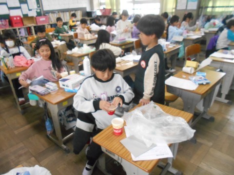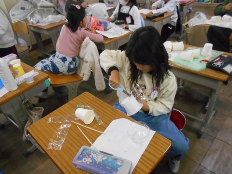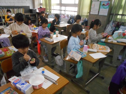 2年生では家から持参した材料をもとに,おもちゃ作りに取り組んでいました。