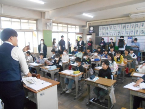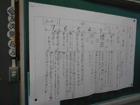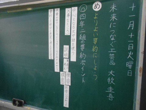 「よりよい要約にしよう」というのが授業のめあて。要約…4年生も難しいことに取り組んでいるんですね。先生が黒板に各形式段落を短くまとめたものを掲示しています。