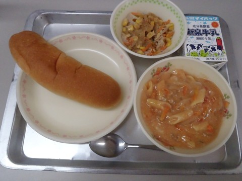 今日の給食は「ミニコッペパン,牛乳,チキンのトマトクリームペンネ,れんこんサラダ」です。
