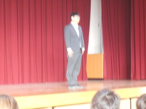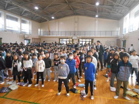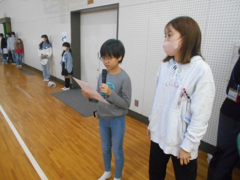 児童の司会で進みます。校長先生と朝の挨拶をして,校歌を斉唱しました♪