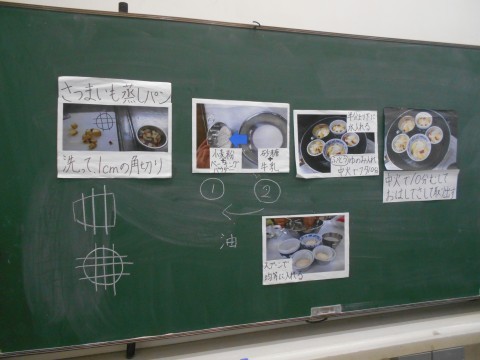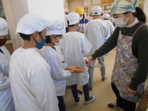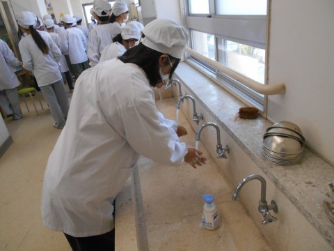 今日の調理実習では「さつまいも蒸しパン」に挑戦! 手を洗って,消毒して,張り切っていきましょう♪