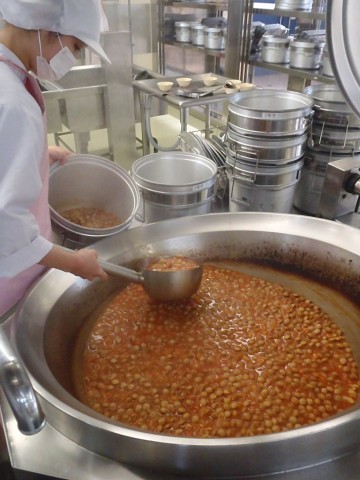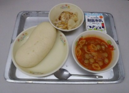 今日の献立は「オリーブパン,牛乳,ミネストローネ,ツナとポテトのマヨネーズ風味焼き」です。