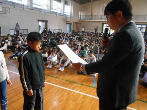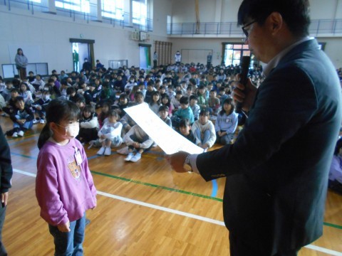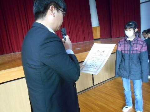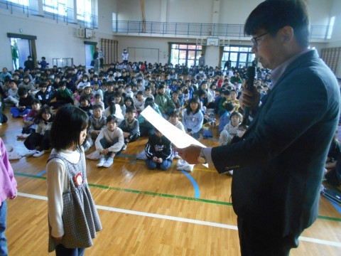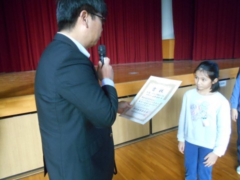 続いて読書感想文コンクールの表彰があり,各学年1名,入選した人がみんなの前で賞状を受け取りました。
