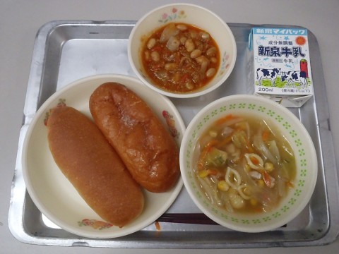 今日の献立は「コッペパン,揚げパン,牛乳,マカロニスープ,ミートビーンズ」です。