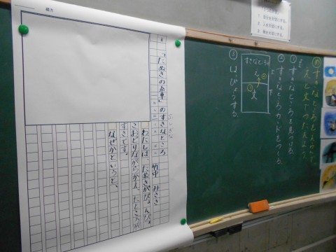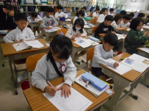 黒板に書き方の「型」が掲示されています。「習う」は「倣う」とも言います。型の真似っこ,大事ですね♪