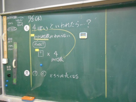 「かける数とかけられる数」の関係を考える時間。大事なポイントです。がんばって!