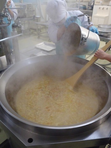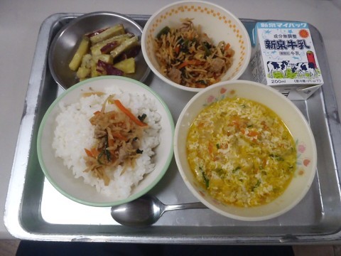 今日の献立は「ごはん,牛乳,卵スープ,ビビンバ風,さつまスティック」です。