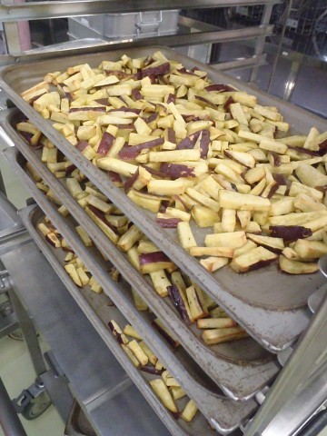 さつまスティックは、さつまいもをたて長に切り、砂糖と油を混ぜあわせオーブンで蒸し焼きにして作っています。
