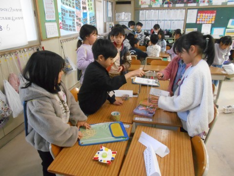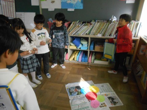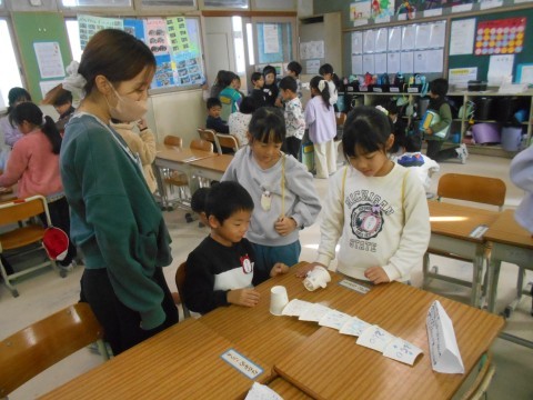 2年生(ピンクの名札)が1年生(赤い名札)に優しく遊び方を説明する姿がいたるところで見られました♪