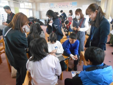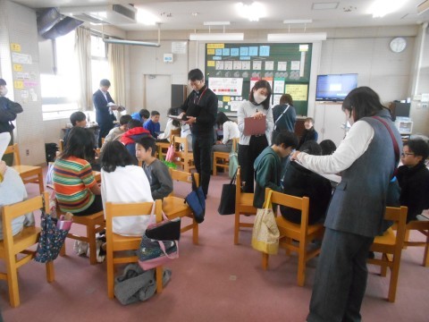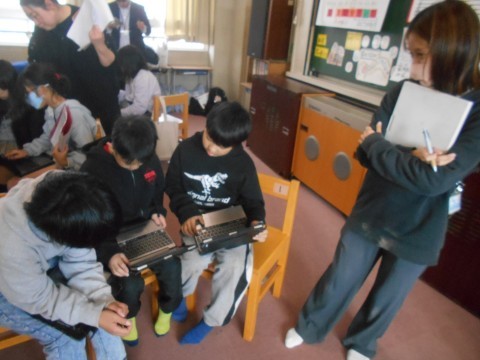 音楽の時間です。公開授業ということで,先生たちが授業の様子を見に来ていました。