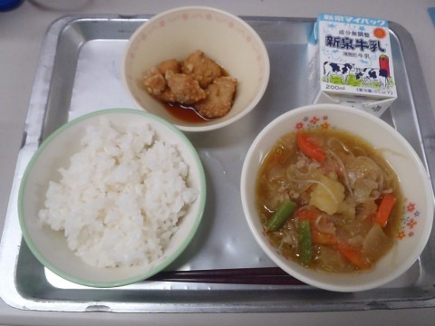 今日の給食は「ごはん,牛乳,肉じゃが,チキン南蛮」です。