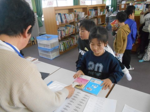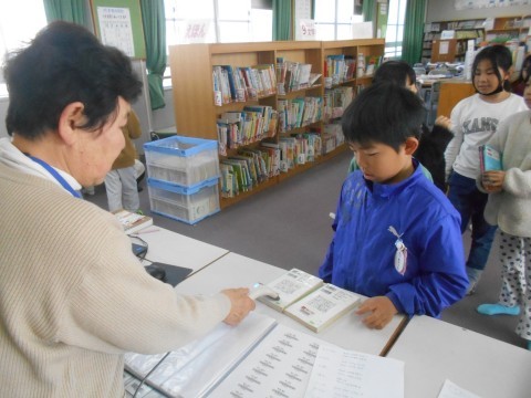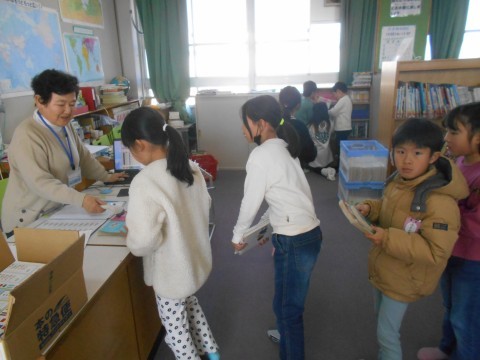 図書の時間です。授業の最初に借りていた本の返却です。