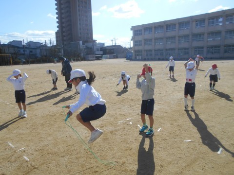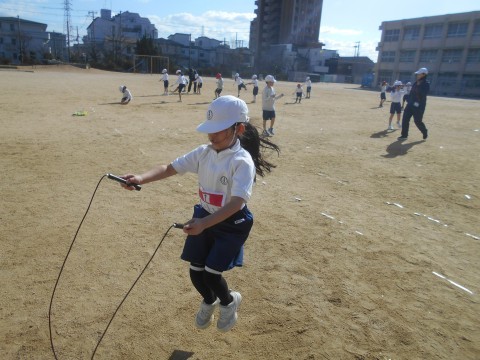 こちらは運動場での体育の様子。なわとびに取り組み中♪