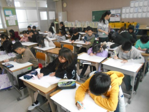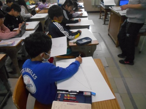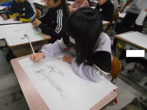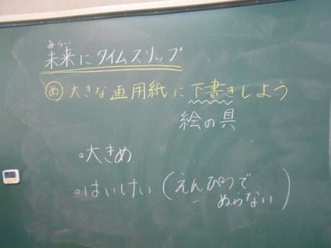 図工の時間です。「未来にタイムスリップ」というテーマで下絵を描いていました。