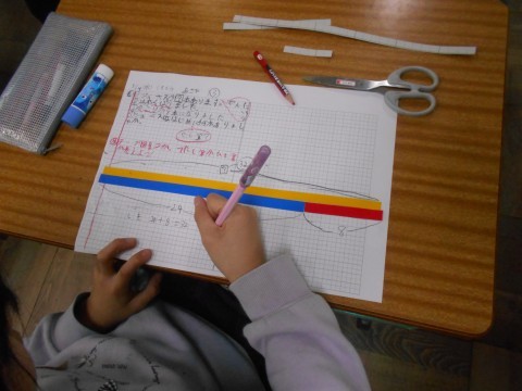 線分図に考え方を書き込んで… 説明できるようになった人同士で交流していました。