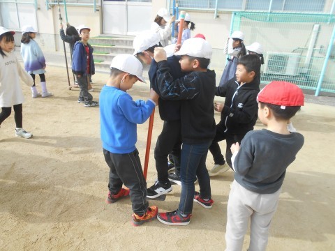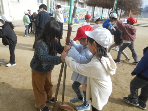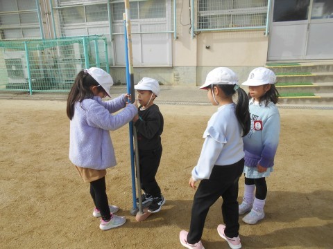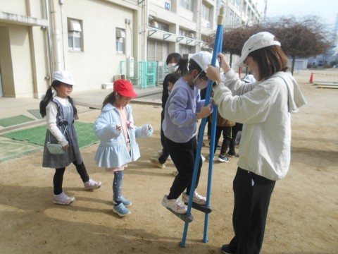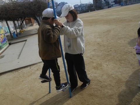 外に飛び出し,「竹馬」に挑戦! 補助ありで体験です。 自分の子どもの頃は「竹馬競争」がありましたが,もはや「今となっては昔のことだが」ですね(笑)
