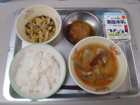 今日の献立は「ごはん,牛乳,さつま汁,照り焼きハンバーグ,小松菜と白菜の炒め煮」です。