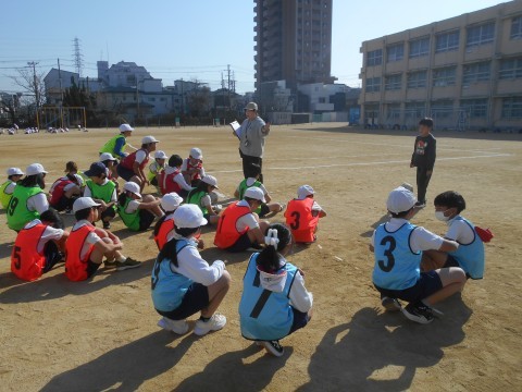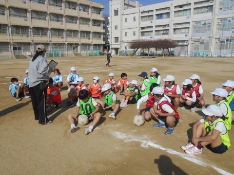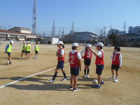 運動場での体育です。ビブスを着て,チームに分かれて取り組むみたい♪