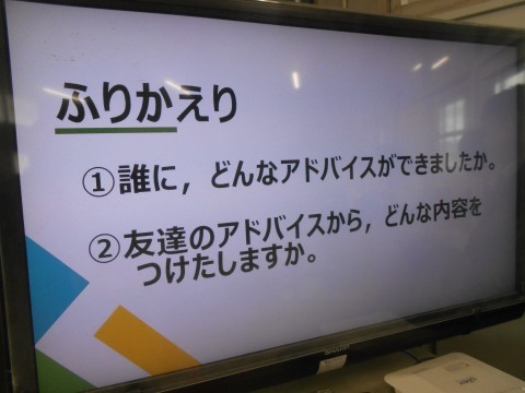 最後に一人ひとりが「アドバイスタイム」を振り返ります。大型モニターに「授業の流れ」が提示され,わかりやすいですね♪