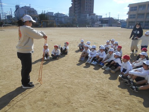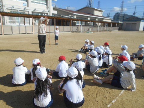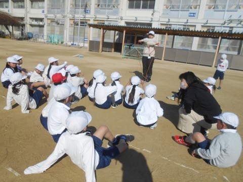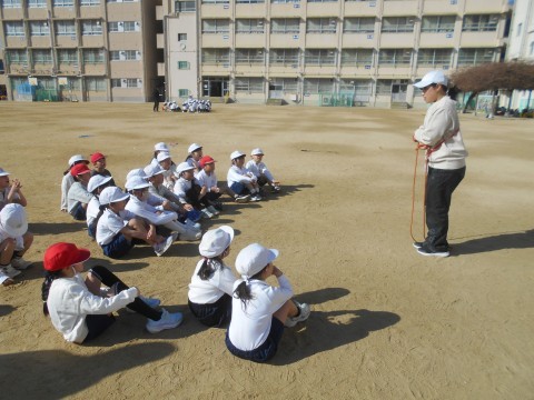 1年生が運動場で体育をしていました。